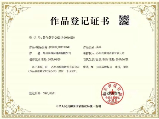 2022.03.16获得国家版权局美术作品登记。这既是对苏州玖城润滑油有限公司形象的积极保护,也是提升玖城润滑油无形资产的有效手段。此次美术作品获得作品著作权登记,意味着玖城润滑油在企业知识产权体系建设与保护又增添了一项新成果。